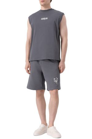 Свитшот с манжетами и поясом в рубчик выполнили из хлопкового трикотажа, усиленного полиэстером. Выбеленную модель с множеством мелких разрывов украсили спереди и на спинке контрастными логотипами.