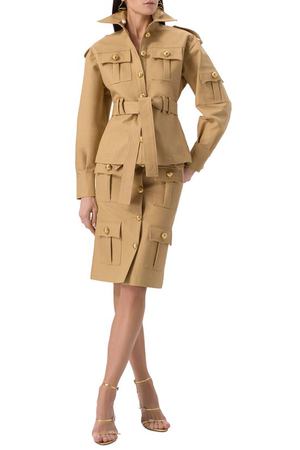 Макси-юбку с асимметричной драпировкой на бедрах выполнили из шелкового атласа. Модель с длинным боковым разрезом и гофрированной вставкой сзади застегивается потайной боковой молнией.