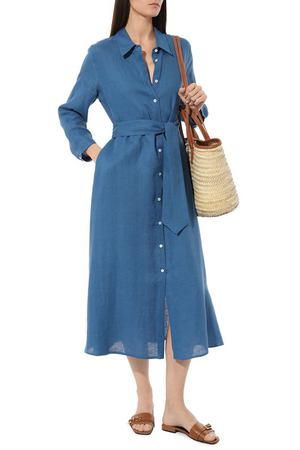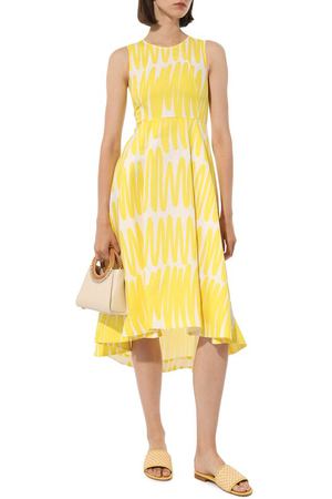 Миди-платье с объемными рукавами 3/4 выполнили из жатого полисилка. Модель с V-образным вырезом украсили спереди драпировкой, напоминающей узел.